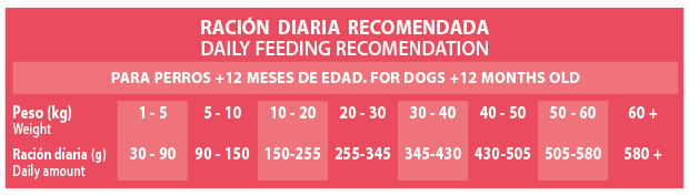 Composición: Carne deshidratada* (19%), Maíz, Trigo*, Salvado de trigo*, Cebada*, Salmón deshidratado* (6%), Grasa animal*, Arroz* (4%), Minerales, Algarroba*, Pollo hidrolizado*, Levadura de cerveza*, Pulpa de remolacha*, Aceite de salmón*, Algas marinas* (0,5%), Prebiótico MOS*, Yuca de mojave*.