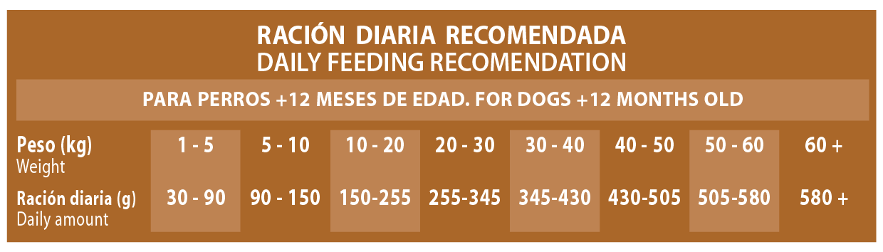 Composición: Carne de cerdo ibérico deshidratada* (14%), Trigo*, Maíz, Salvado de trigo*, Arroz* (12%), Carne deshidratada* (12%), Cebada*, Grasa animal*, Algarroba*, Pulpa de remolacha*, Pollo hidrolizado*, Levadura de cerveza*, Aceite de salmón*, Minerales, Algas marinas* (0,5%), Prebiótico MOS*, Yuca de mojave*.